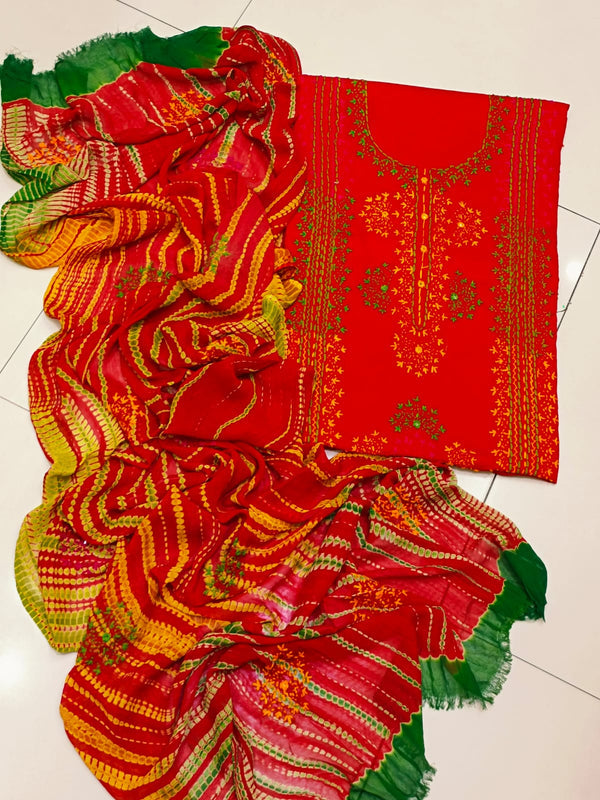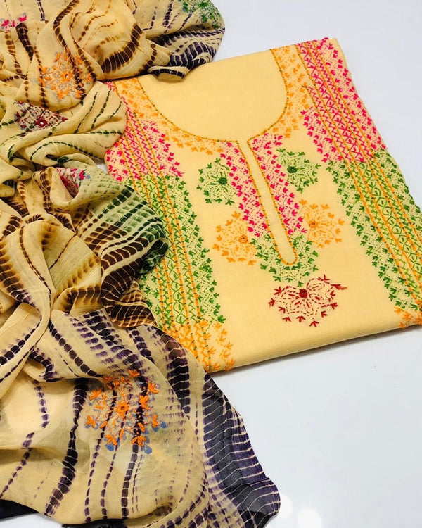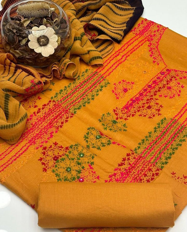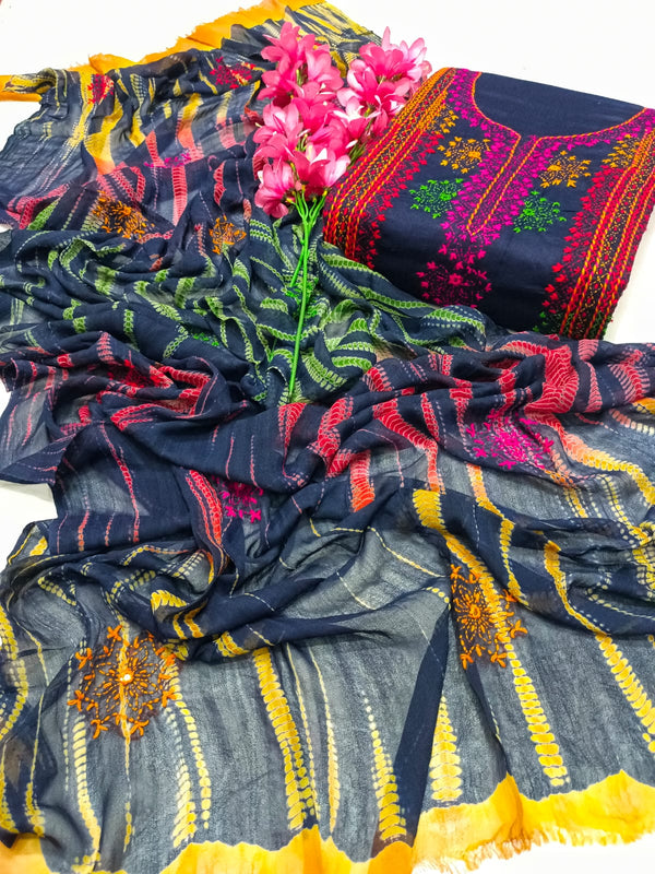 Experience bold tradition with our Afghani Style Lawn Suits, featuring 5 meters of premium lawn fabric. The plain trouser pairs beautifully with a heavily embroidered shirt adorned with authentic Afghani-style threadwork and original mirror detailing. Completed with a chiffon tie-dye dupatta enhanced with delicate embroidery — this outfit blends ethnic charm with modern flair.