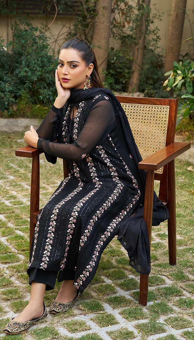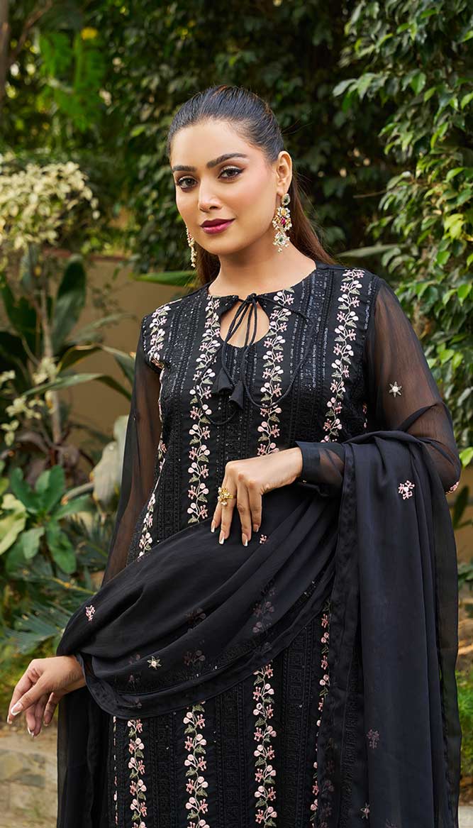 Enjoy the delicate charm of this delicate outfit, This deep maroon chiffon dress, embellished with embroidery adds depth and elegance, displays rich refinement. This dress's rich colour and elaborate details show an elegant appeal. The chiffon drapes wonderfully, producing a flowing silhouette perfect for festivities.