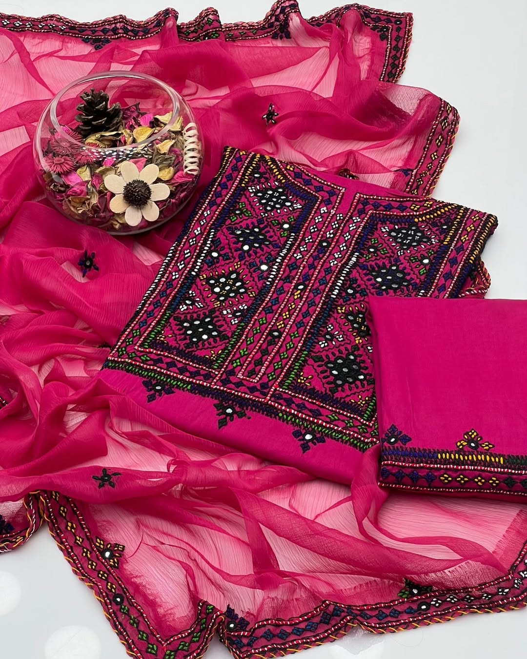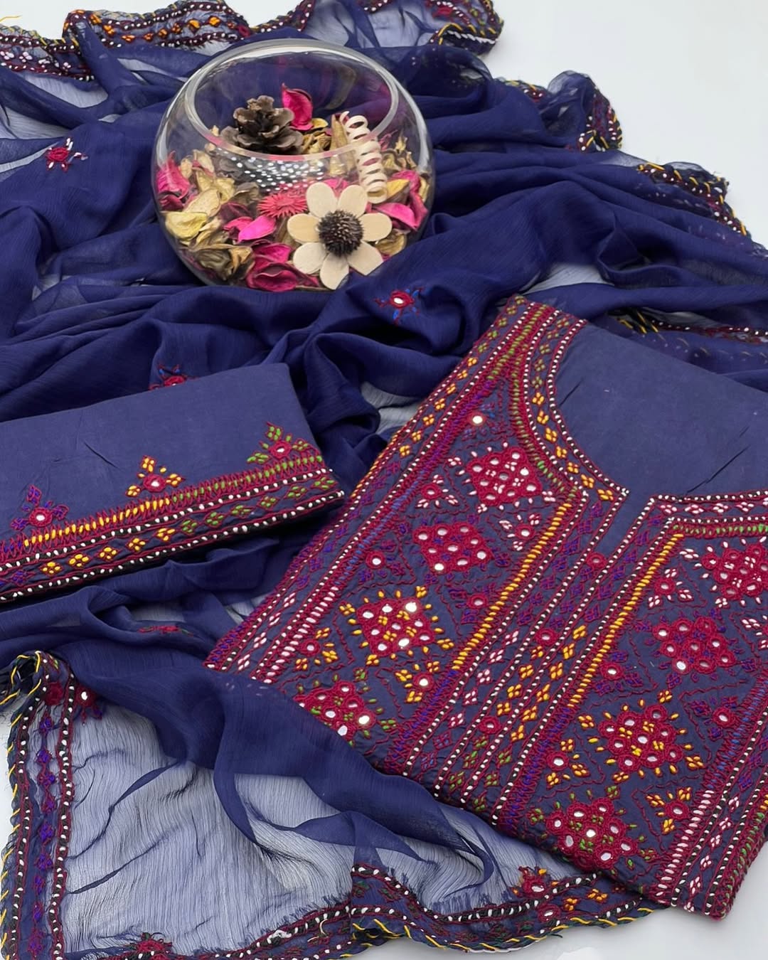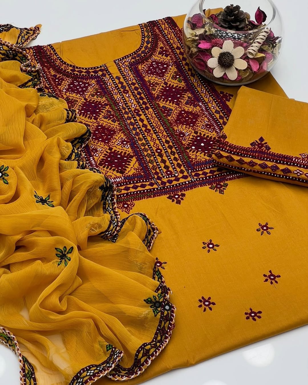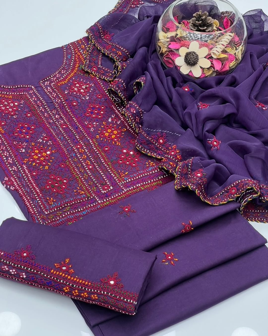 Soft Cotton Lawn Handmade Balouchi Gala Shirt, Embroided Trouser Along With 4 Side Embroided Chiffon Dupatta 3 Pcs Dress 👗